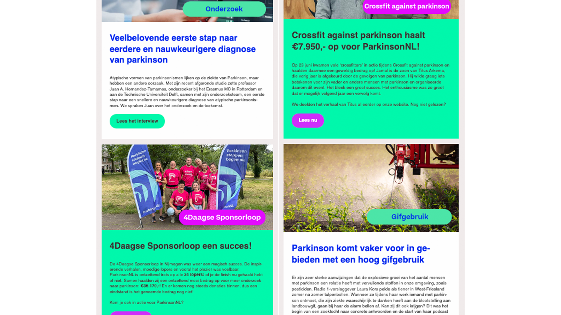 Het geld dat wordt ingezameld tijdens de Online Collecte 10-daagse wordt gebruikt om onderzoek te financieren naar de invloed van vervuilende stoffen op de ontwikkeling van parkinson. Onderzoek hiernaar is essentieel om meer te weten te komen over hoe we parkinson kunnen afremmen en… voorkomen. Schrijf je in voor de nieuwsbrief om hiervan op de hoogte te blijven.